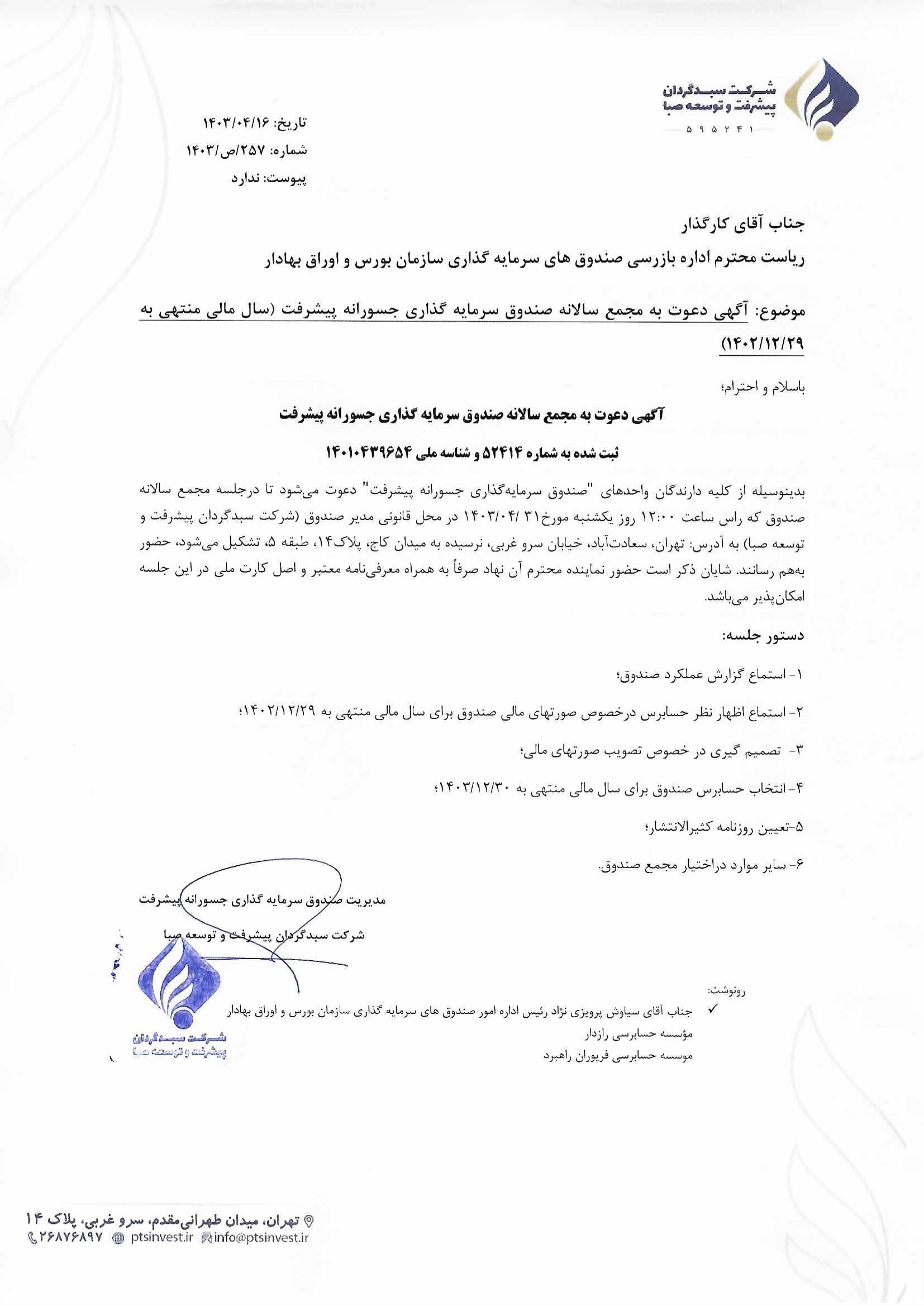 آگهی دعوت به مجمع سالانه صندوق سرمایه گذاری جسورانه پیشرفت مورخ ۱۴۰۲/۰۴/۲۵